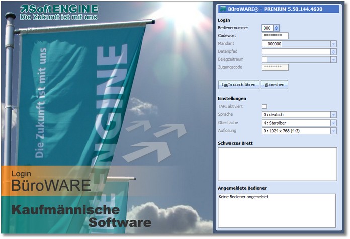 Zunächst startet das Programm mit dem User-Login. Wenn Sie das Programm starten, müssen Sie immer zuerst Ihre Bedienernummer und Ihr Passwort eingeben. Voreingestellt ist der Bediener 000 (Systemadministrator) ohne Passwort.