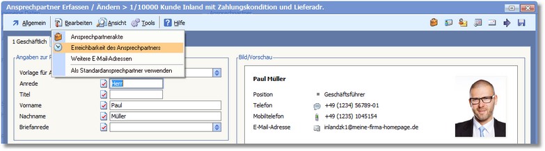 2. Klicken Sie in der Symbolleiste auf <Bearbeiten> und anschließend auf "Erreichbarkeit des Ansprechpartners":