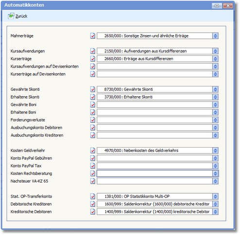 Der Menüpunkt „Bearbeiten > Automatikkonten" der Basisdaten dient der Automatisierung von Buchungsvorgängen bei: