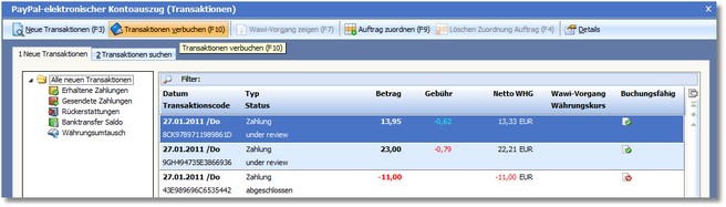 Mit [F11] können Sie sich den Kontoauszug der im Firmenstamm hinterlegten PayPal-Bank anzeigen lassen.