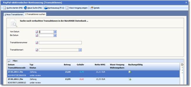 Mit [F8] können Sie mit den in den Selektionsfeldern der Maske eingegebenen Werten nach einer oder mehreren verbuchten PayPal-Transaktionen suchen.