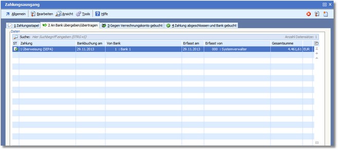 Mit nochmaligen Betätigen der [F9]-Taste wird der Zahlungsstapel in die Karteikarte "3 Gegen Verrechnungskonto gebucht"" verschoben.