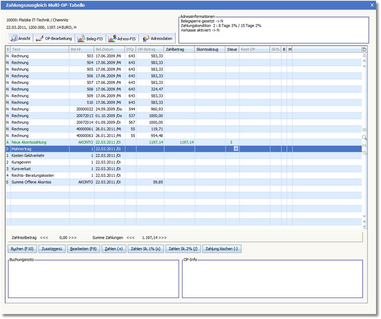 Der nächste Vorgang wäre nun die Verbuchung der erhaltenen Anzahlung in der Fibu über die Spezialbuchungsart "Multi OP Ausgleich". Dies deshalb, da bei Erfassung dieser Akontozahlung (erhaltene Anzahlung) speziell der