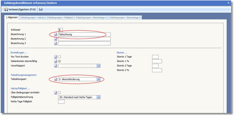 Vor Beginn der Erfassung einer Teilrechnung/Teilzahlung/Schlussrechnung müssen innerhalb der Basisdaten in der Wawi/Fibu entsprechende Zahlungskonditionen angelegt werden.