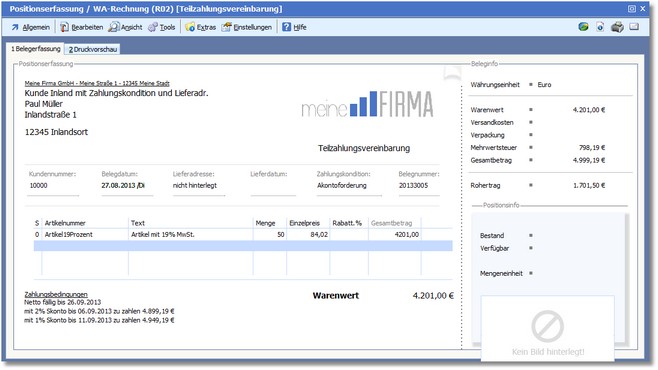 c) Jetzt kann die Erfassung einer Teilrechnung innerhalb der Warenwirtschaft erfolgen. Hierbei muss in der Belegerfassung die entsprechende Zahlungskondition für die Teilrechnung eingetragen werden. Bestätigen Sie Ihre Eingabe mit [RETURN].