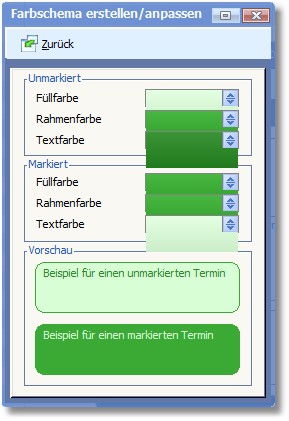 Diese Optionsmaske wird über den Menüeintrag "Bearbeiten > Farbschema erstellen/anpassen" im Bearbeitungsdialog der Terminkategorien aufgerufen. Hier können Sie einstellen, wie Termine dieser Terminkategorie farblich dargestellt werden sollen, wenn Sie markiert bzw unmarkiert sind.