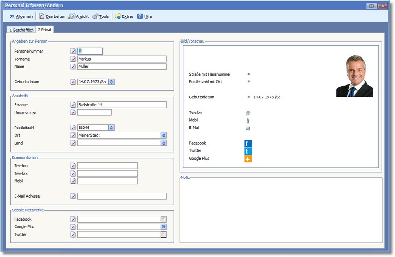 In dieser Karteikarte können Sie private Daten des Mitarbeiters wie Geburtsdatum, Wohnort usw. eintragen.