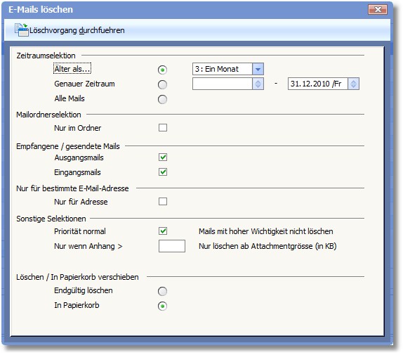 3. Klicken Sie mit der Maus auf den Button <Löschvorgang durchführen>, um die Mails gemäß der festgelegten Optionen zu löschen.
