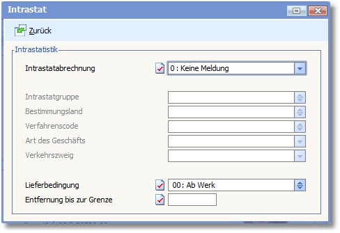In dieser Maske können Sie die Parameter für die Intrastatmeldung hinterlegen, soweit die Ein- bzw. Ausfuhren für diese Adresse gemeldet werden müssen.
