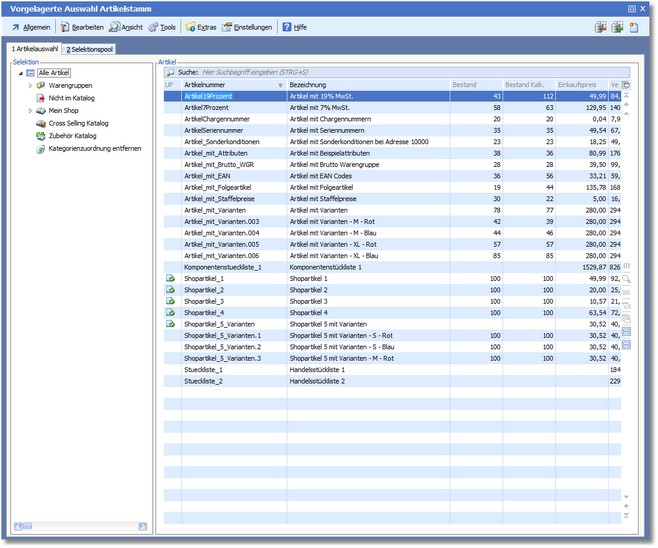 In der zentralen Auswahltabelle des Artikelstamms werden alle Artikel angezeigt und können von hier bearbeitet werden.