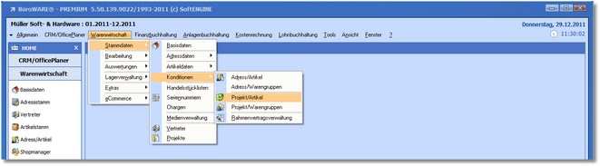 1. Klicken Sie mit der Maus im Hauptmenü auf "Warenwirtschaft / Stammdaten / Konditionen / Projekt/Artikel".