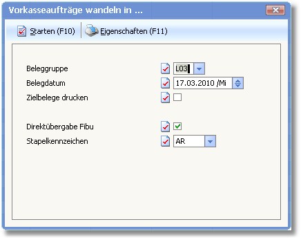 Mit [F10] wandeln Sie die Aufträge in die angegebene Beleggruppe. Ist die Fibu-Übergabe aktiviert, so werden die erstellten Rechnungen an die Fibu übergeben und das Konto erhaltene Anzahlungen gegen das entsprechende Verrechnungskonto aufgelöst.