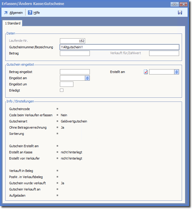 Hier legen Sie mit der Taste [F3] oder über das Menü "Allgemein" einen neuen Gutschein an.