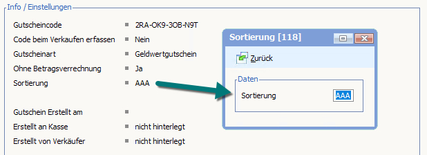 Damit kann man sicherstellen, dass der Gutschein am Anfang der Liste (ggf. mit anderen Gutscheinen der Sortierung "AAA" angezeigt wird).