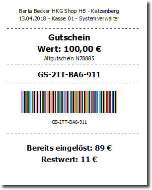 Dieser enthält den Hinweis auf den "Altgutschein" sowie den ursprünglichen und den Restbetrag.