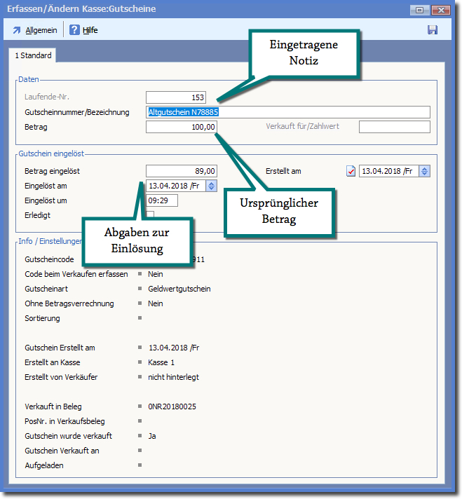 Über den Differenzbetrag wird dann ein neuer Gutschein, erstellt nach den Regeln der neuen Kasse, ausgestellt.