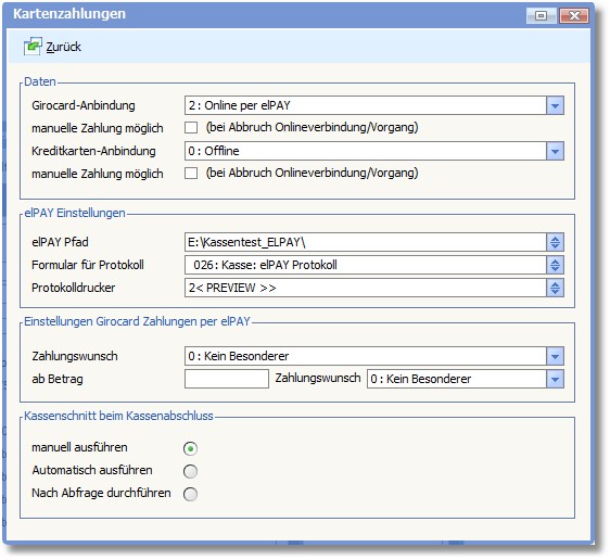 Die Kartenzahlungs-Funktion können Sie nutzen, wenn der Kunde mit Kredit- oder EC-Karte zahlen möchte. In dieser Optionsmaske können Sie Einstellungen hinterlegen, wenn Sie das Kartenzahlungssystem elPAY einsetzen oder wenn Sie ein anderes Kartenzahlungssystem verwenden.