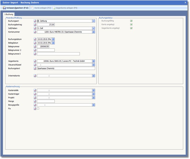 3. Mit [RETURN] oder Klick auf den Button <Bearbeiten> gelangen Sie in den Dialog "Datev-Import - Buchung ändern", wo Sie die Buchung nun wie gewohnt bearbeiten können.