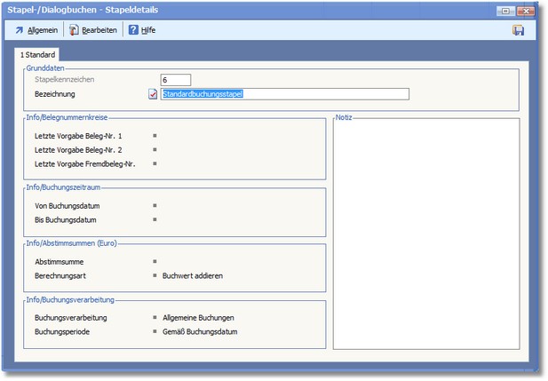 Die Eigenschaften eines Buchungsstapels werden in der Karteikarte "Standard" des Bearbeitungsdialogs festgelegt: