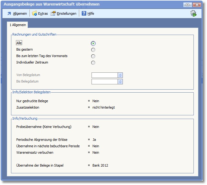 Hier legen Sie durch Aktivierung des entsprechenden Radiobuttons fest, für welchen Zeitraum Sie Belege übernehmen wollen: