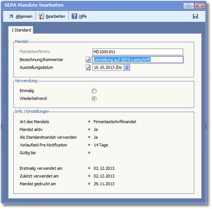 Im Bearbeitungsdialog der SEPA-Mandate sind folgende Felder auszufüllen: