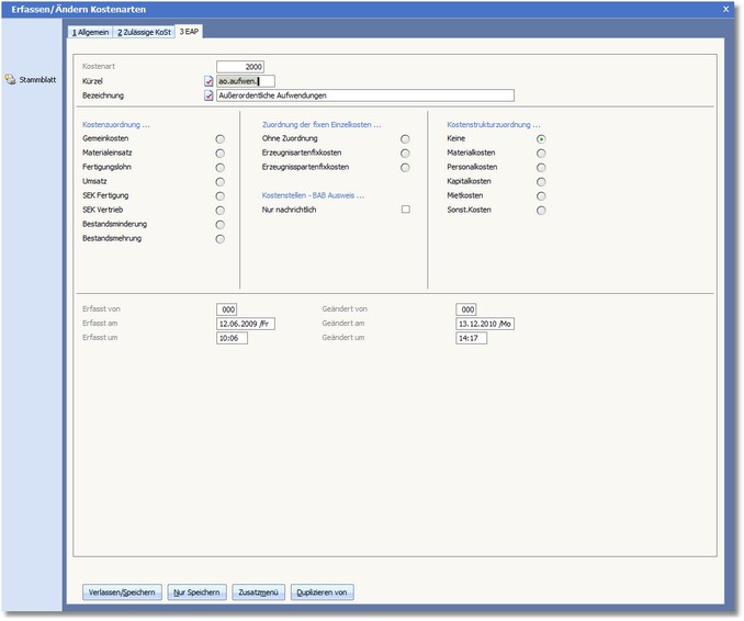 << Hier KLicken um eine Inhaltsübersicht anzuzeigen >> Navigation: Kostenrechnung > Stammdaten > Kostenarten > Die Karteikarte "EAP" |