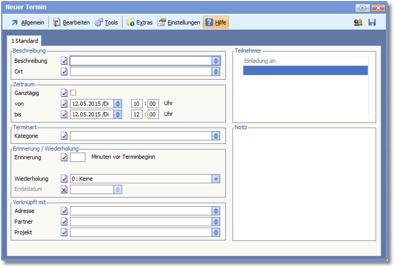 Dieses Dialogfenster wird aufgerufen, wenn Sie einen Termin neu anlegen oder einen bestehenden Termin bearbeiten. Hier können Sie Ihre Termindaten eintragen.