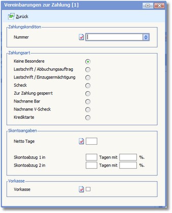 Übernommen werden die innerhalb der Zahlungskondition hinterlegten Tage und die jeweils möglichen Skontoprozentsätze bei Zahlung innerhalb der angegebenen Frist (Tage).