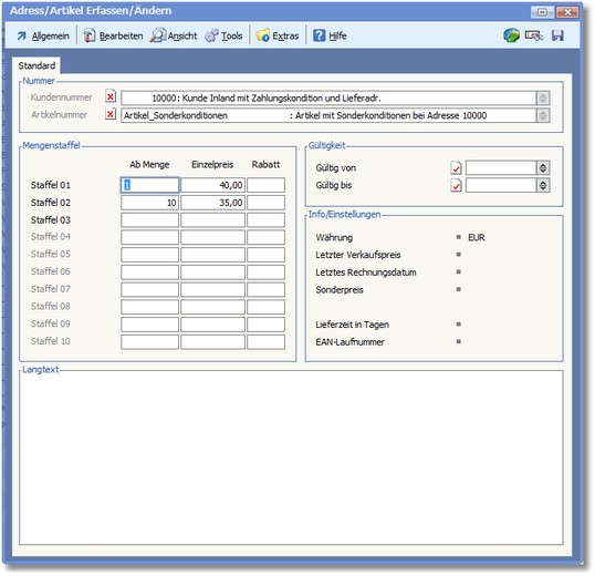 << Hier KLicken um eine Inhaltsübersicht anzuzeigen >> Navigation: Warenwirtschaft > Stammdaten > Konditionen > Adress/Artikel > Die Karteikarte "Standard" (Debitoren) |