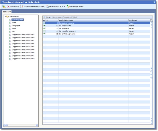 Jeder Artikel erhält automatisch alle Attribute aus der Standardgruppe, außerdem kann eine weitere Attributgruppe beim Artikel hinterlegt werden. |