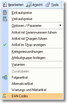 1. Klicken Sie in der Artikelbearbeitung mit der Maus auf den Menüpunkt "Bearbeiten > EAN-Codes".