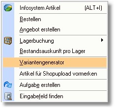 4. Wählen Sie in der Artikelbearbeitung den Menüeintrag "Tools > Variantengenerator".
