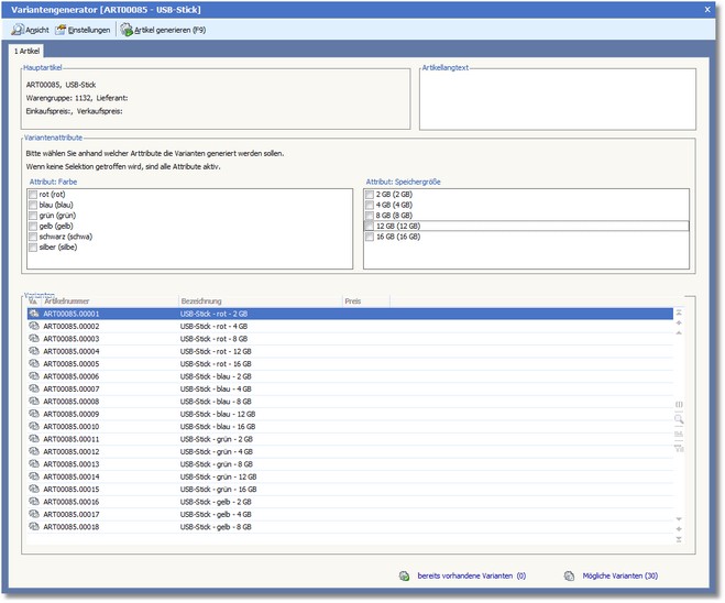 Sämtliche Varianten eines Artikels können mit dem Variantengenerator angelegt werden, vorausgesetzt, dass dem Hauptartikel Attribute und eine Attributgruppe zugewiesen wurde.