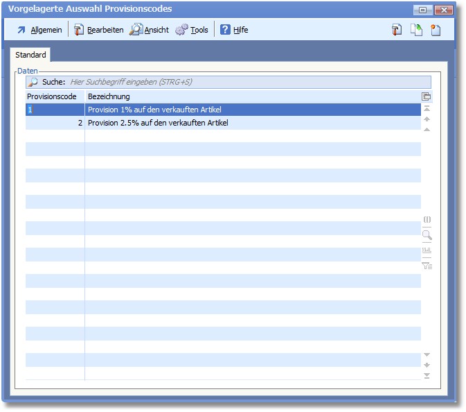 In einer vorgelagerten Auswahltabelle werden alle vorhandenen Provisionscodes angezeigt.