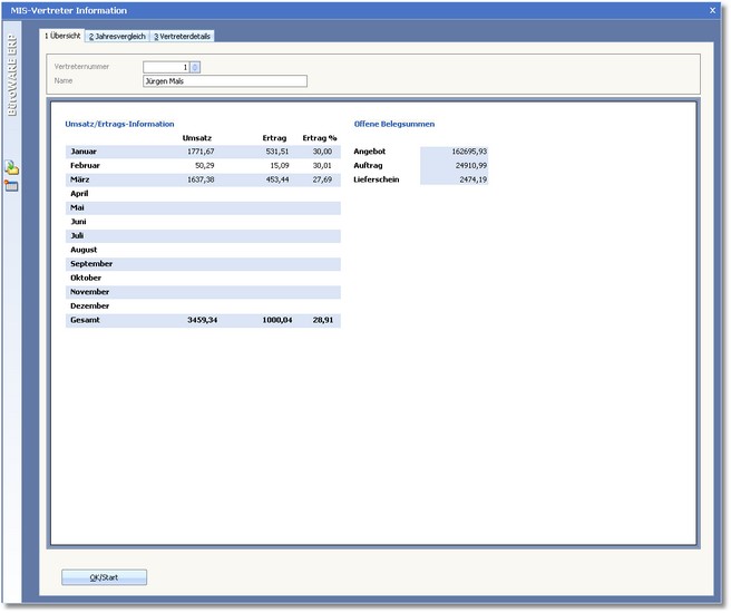 Auf der Karteikarte "Jahresvergleich" erhalten Sie Umsatzinformationen des Vertreters im laufenden Geschäftsjahr und Sie können dieselben mit den Umsätzen der Vorjahre vergleichen.