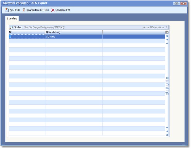 Hier können Sie Exportvorlagen anlegen, bearbeiten und löschen. [F3] bzw. [RETURN] öffnet hier den AES-Dialog, wo Sie die gewünschten Werte eintragen und mit [F10] speichern können.