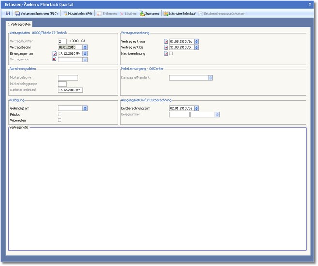 Das Programm vergibt die Vertragsnummer automatisch. Die Vertragsnummer bildet das Ordnungskriterium für Verträge innerhalb eines Vertragstyps und ist adressbezogen.