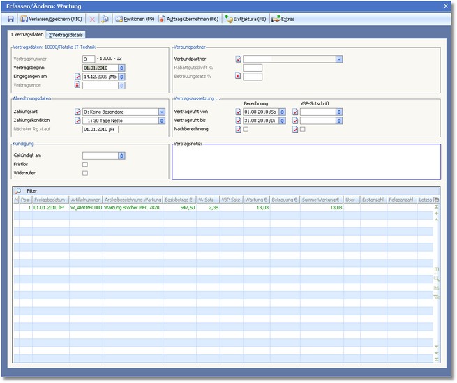Mit der Funktionstaste [F10] schließen Sie den Dialog und speichern die Eingaben. Das Programm kehrt zur vorgelagerten Auswahltabelle des Vertragscenters zurück.