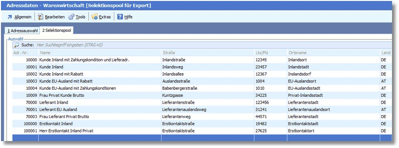 Es soll eine Selektion aufgebaut werden, welche nur Adressen in den Selektionspool holt, die aus Deutschland oder Österreich kommen, in den Adressgruppen 1 "Geschäftskunden" und "Auslandkunden EU" vorhanden sind und kein Lieferant oder Erstkontakt sind, z.B.:
