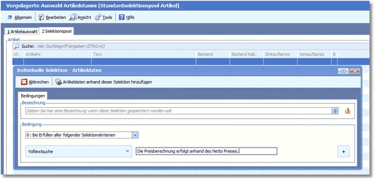 << Hier KLicken um eine Inhaltsübersicht anzuzeigen >> Navigation: Warenwirtschaft > Stammdaten > Selektionspools > Neuerungen Selektionspool > Selektion über Volltext |
