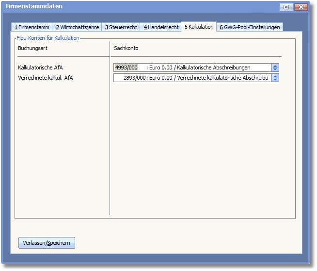 Hier werden die Konten angegeben, die für die Übergabe der kalkulatorischen Abschreibungen an die Finanzbuchhaltung benötigt werden.