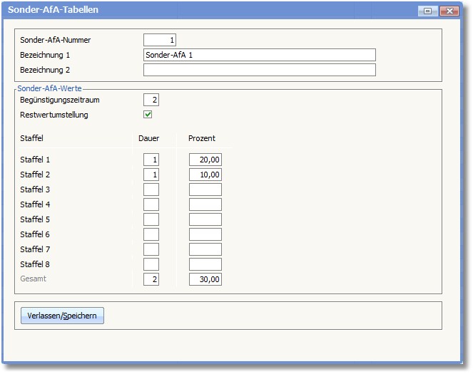 Im folgenden Tabellenbereich des Eingabedialoges werden die Sonder-AfA-Sätze verwaltet. Hierfür stehen bis zu 8 Staffeln zur Verfügung.