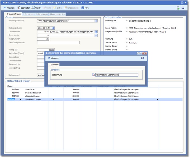 1. Öffnen Sie den Buchungsbereich über das Hauptmenü „Finanzbuchhaltung > Stapelbuchungen". Das Programm öffnet zunächst die Stapelauswahl mit der Karteikarte "Buchungen". 2. Aktivieren Sie hier die Karteikarte "Schablonen" und drücken Sie [F3], um einen neuen Stapel zu erfassen. 3. Legen Sie eine BEZEICHNUNG für den Stapel fest und speichern Sie Ihre Eingaben mit [F10]. 4. Starten Sie den Stapel mit [RETURN] und erfassen Sie die Buchung als normale Aufteilungsbuchung. 5. Nach kompletter Aufteilung bestätigen Sie die nachfolgende Abfrage nach der Verbuchung mit <ja>. 6. Nach der Verbuchung legen Sie eine Bezeichnung für die soeben erstellte Buchungsschablone fest und speichern Sie diese Eingabe mit [F10].
