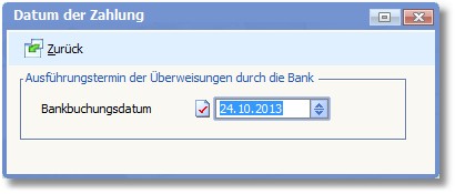 << Hier KLicken um eine Inhaltsübersicht anzuzeigen >> Navigation: Finanzbuchhaltung > Laufende Vorgänge > Zahlungsverkehr > Zahlungsausgang > Die Karteikarte "Zahlungsstapel" > Neuen Zahlungsstapel anlegen > Neuen Zahlungsstapel anlegen - Menü > Bankbuchungsdatum |