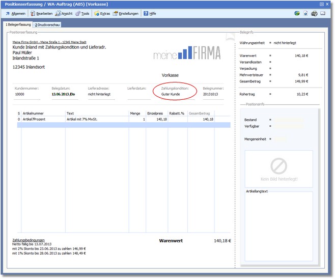 4. In der Positionserfassung klicken Sie mit der Maus auf den Bereich "Zahlungskondition".