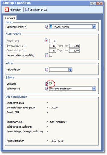 5. Im Dialogfenster "Zahlung/Kondition" aktivieren Sie nun die Option "Vorkasse" und speichern Ihren Änderung mit [F10].