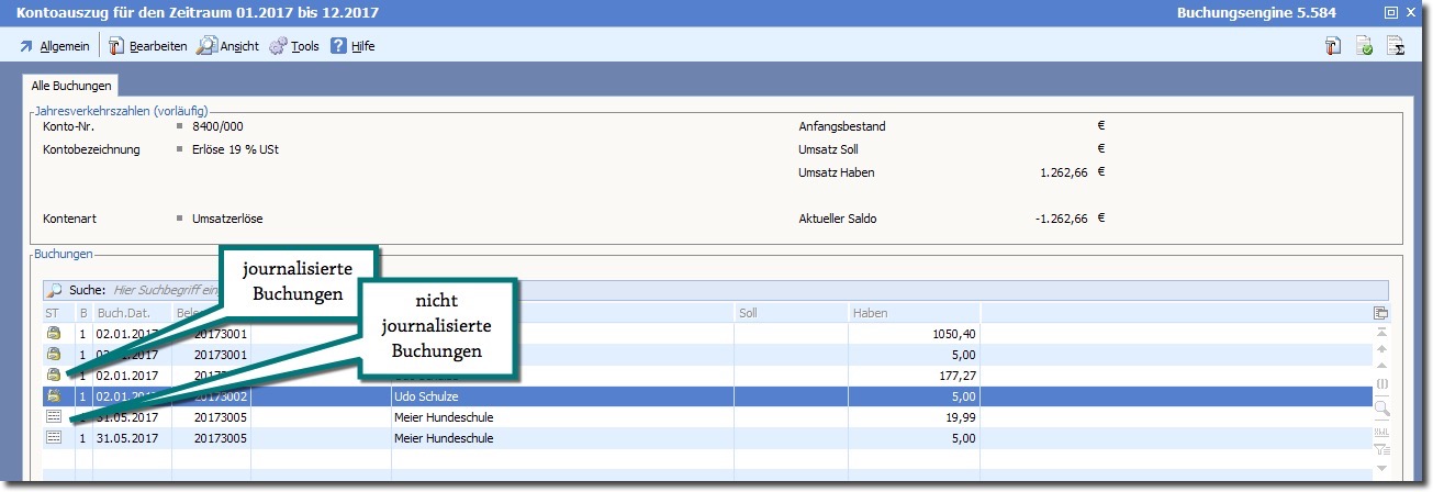 Am Symbol in der ersten Spalte (bzw. der Spalte “Statusbitmap” erkennen Sie, ob die Buchung bearbeitet werden kann oder journalisiert ist.