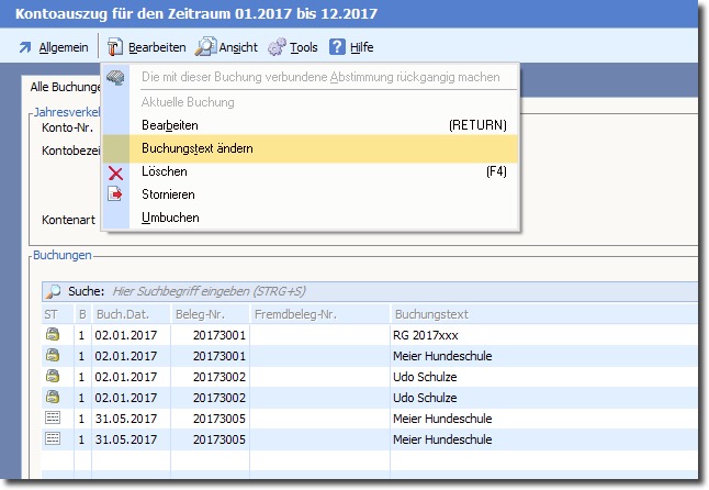 Die Funktion, um den Buchungstext zu ändern, finden Sie im Menü “Bearbeiten”. Dort steht der Eintrag “Buchungstext ändern” zur Verfügung.
