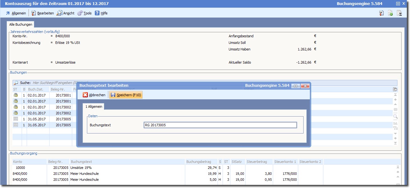 Drücken von “F10” oder Klick auf den Button “Speichern (F10)” übernimmt den geänderten Text in die Buchung. Dabei ist zu beachten, dass eine Buchung ggf. aus mehreren Buchungstexten besteht. Es wird immer nur ein Bestandteil geändert.