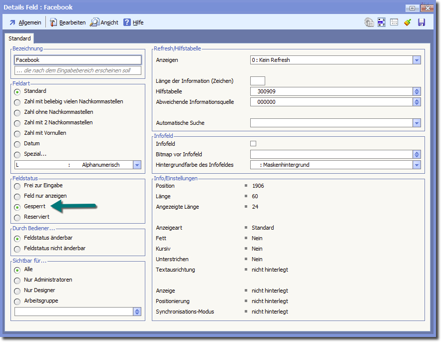 Somit ist auch die einfach Möglichkeit gegeben, ein versehentlich gesperrtes Feld wieder an der ursprünglichen Stelle sichtbar zu machen (Designerberechtigung, entsprechende Kenntnisse und Lizenz vorausgesetzt).